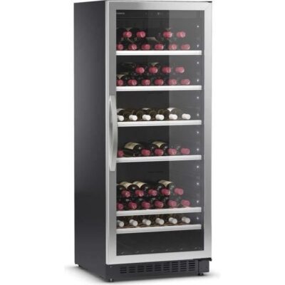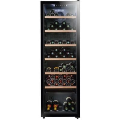 156 bouteilles. 1 zone de température. 4 clayettes en bois. Fronton en bois. Contrôle électronique.
